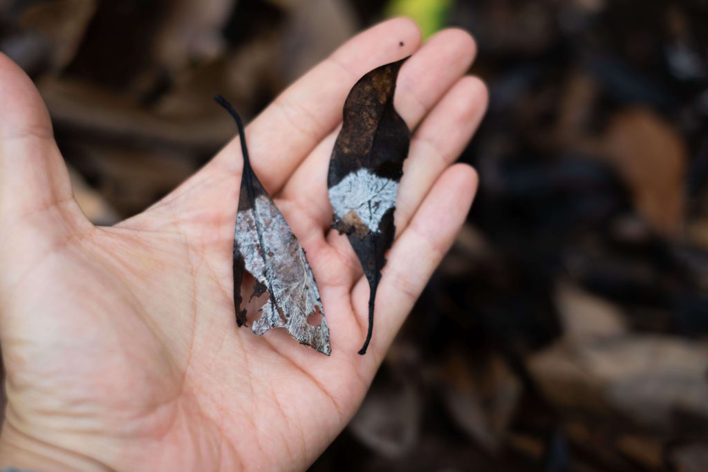 謎はこの落ち葉の絨毯にある。茶色の葉に白い菌糸がついているものがあった。これは微生物が落ち葉を分解し、植物が吸収しやすい無機物に変えている段階。この菌糸からキノコが誕生する場合もある。完全に分解された場合、腐葉土と呼ばれる黒いふかふかした土になる。そうして、微生物の活動が活発になり、土壌の生態系が豊かになる。菌類は自然界でとても重要な役割をになっているのだ。このように菌類は「分解者」としての役割がある。