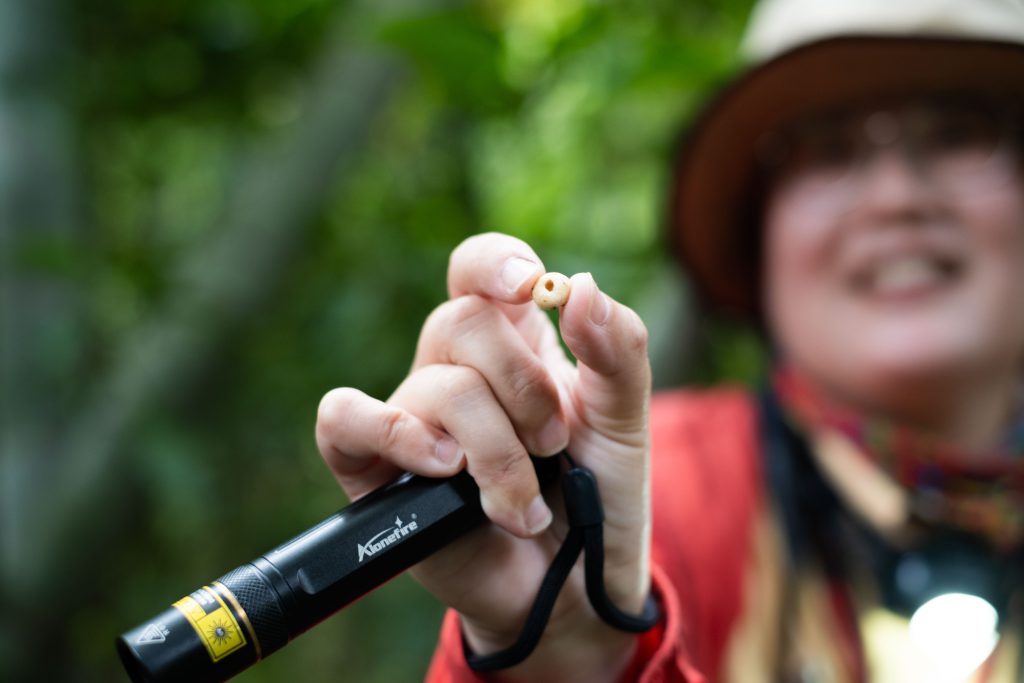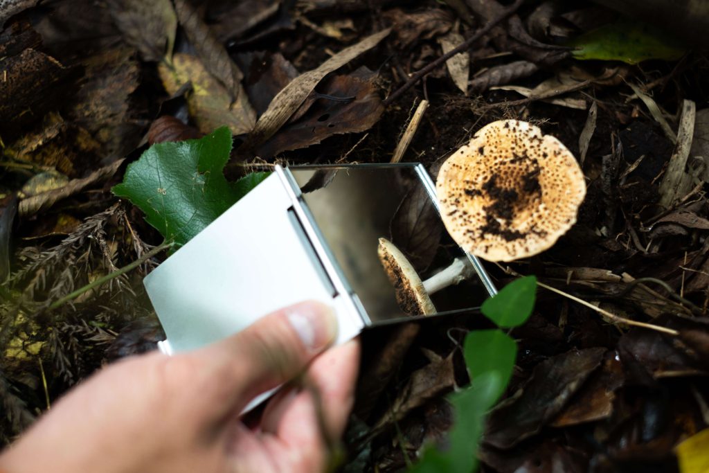 そんなとき、ガイドさんがさっと後ろから出してくれたのは鏡。きのこに近づけると、なんと傘の裏側のヒダまでみえる。しかも、地面に這いつくばることなく、視点を変えることができる。画期的な観察道具である。他にもライトがあると、見つけやすいし、虫眼鏡があるとまた違う繊細な視点が得られる。ミクロなキノコを観察するには、ミクロな視点が必要になる。