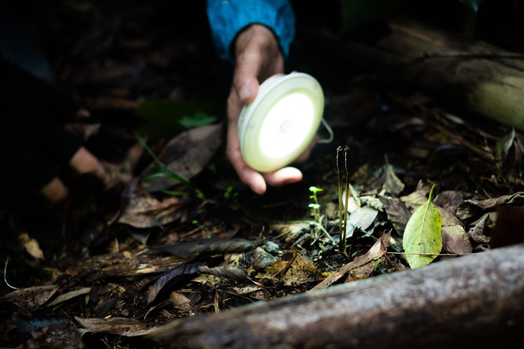 菌は湿気のある暗い場所を好む。ライトがあると、見つけやすい。