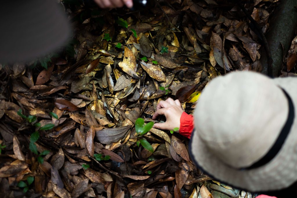 ガイドさんが、またもやしゃがんで落ち葉を見つめている。今度こそはと、駆け寄ってみる。少し目が慣れたのか少し早くみつけられた。見つけたのは「ヒトヨタケ」。だが、落ち葉に埋もれていて形状がわからない。生まれたばかりの繊細な彼らを壊さないように、丁寧にかきわける。キノコからすると、いい迷惑だ。やっとこの世に誕生したばかりなのに。けれど好奇心に火がついた私は前のめり。どんな形をしているのだろう?色や名前、引いては食感までもが気になって仕方がない。