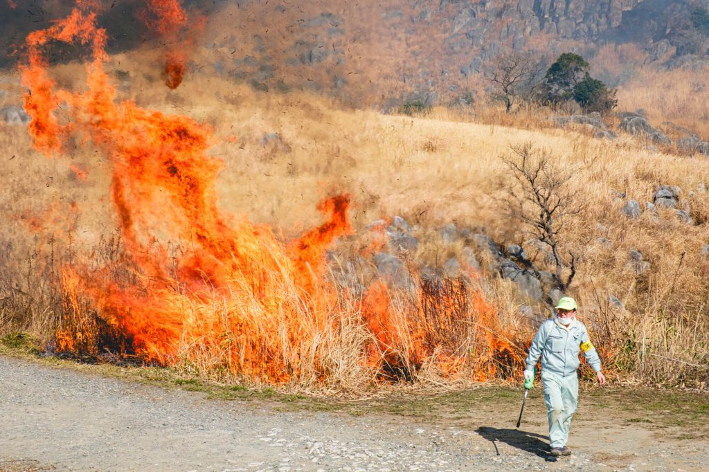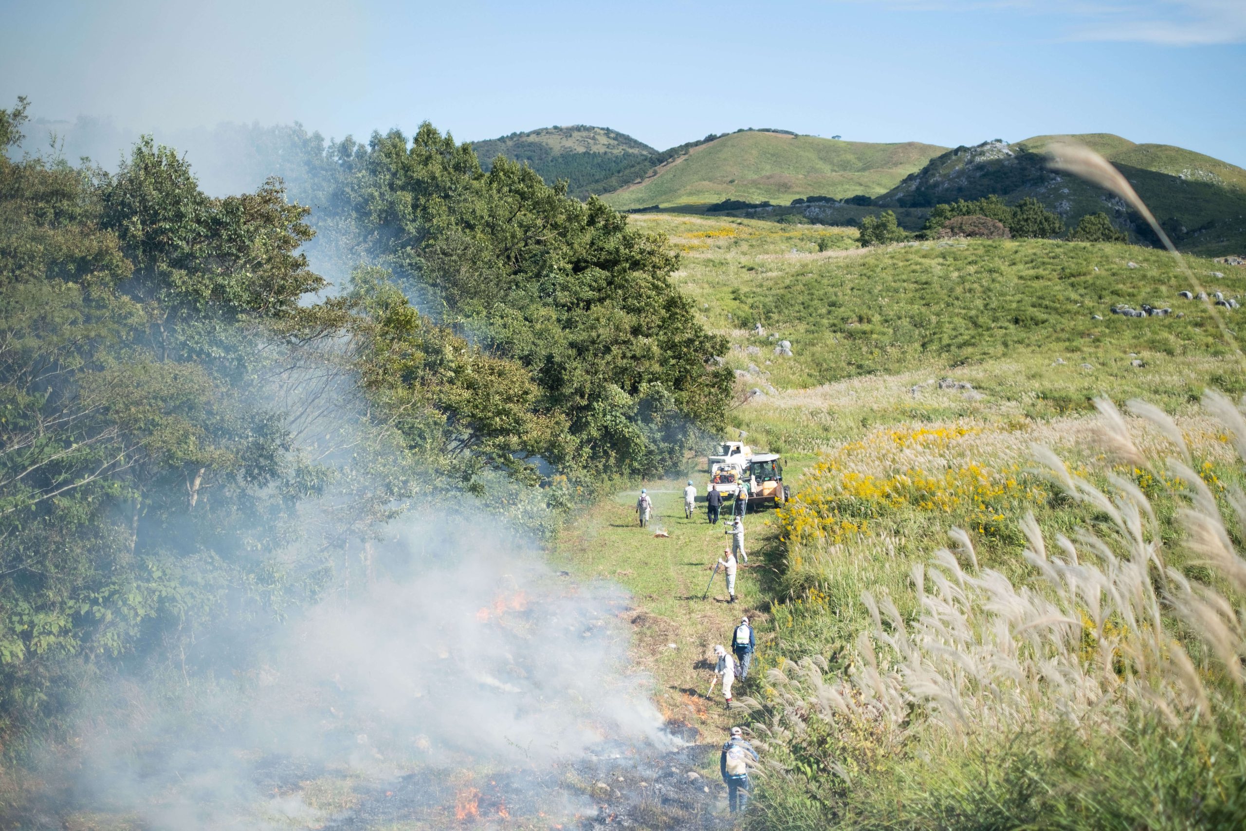 野焼きは、緻密な計画のもとに行われるチーム作業だ。10月の、まだ野焼きには早い時期に行われる「防火帯焼き」もその一つ。火が燃え広がらないよう、あらかじめ火の通り道にある草を焼き、緩衝地をつくるのである。
